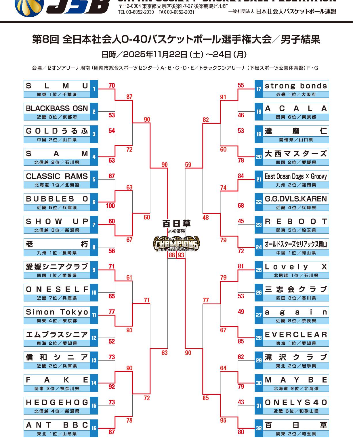 11月242025 2025社会人 第8回 全日本社会人O-40/O-50バスケットボール選手権大会期日2025年11月22日(土)~24日(月)会場ゼオンアリーナ周南/トラックワンアリーナ大会特設ページへ千葉県代表O-40男子 SLMU 準優勝O-40女子 ハンプティダンプティ結果